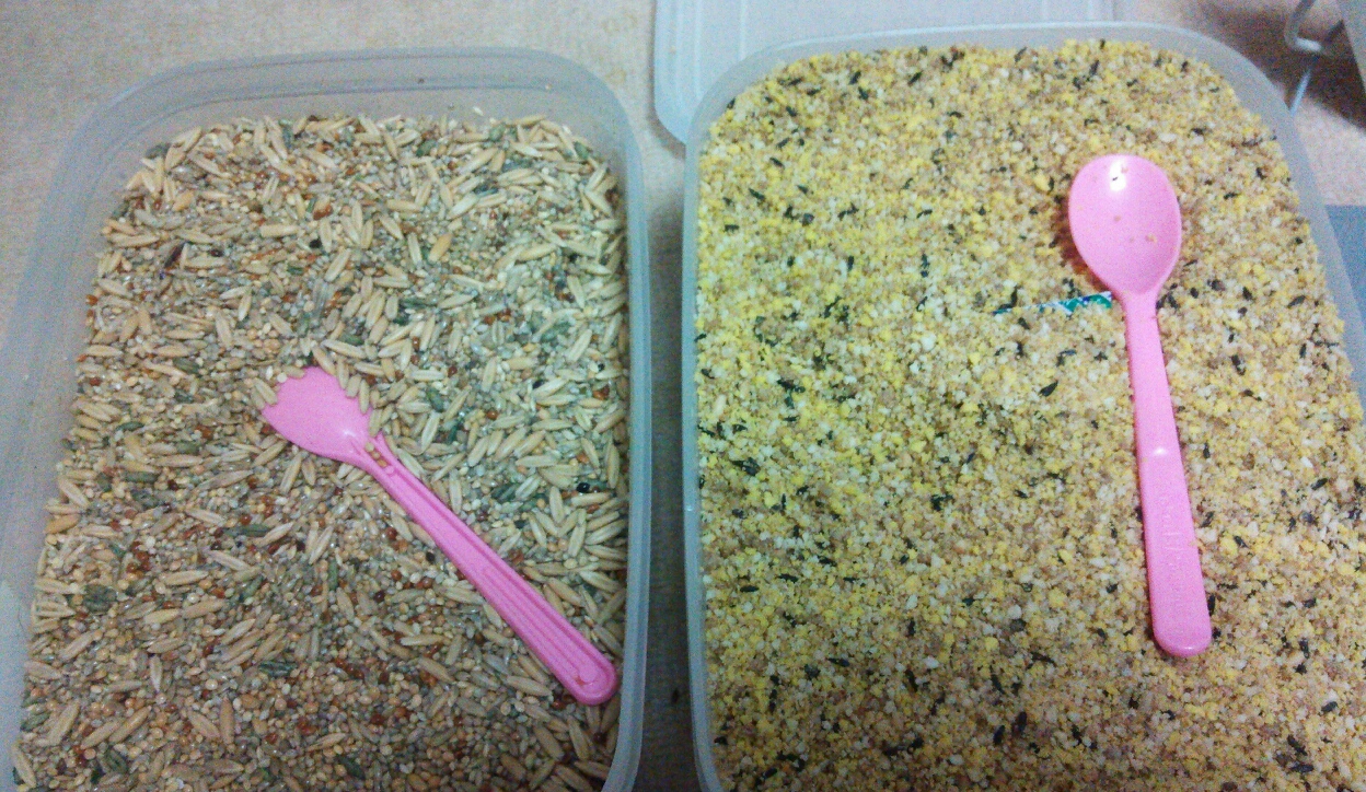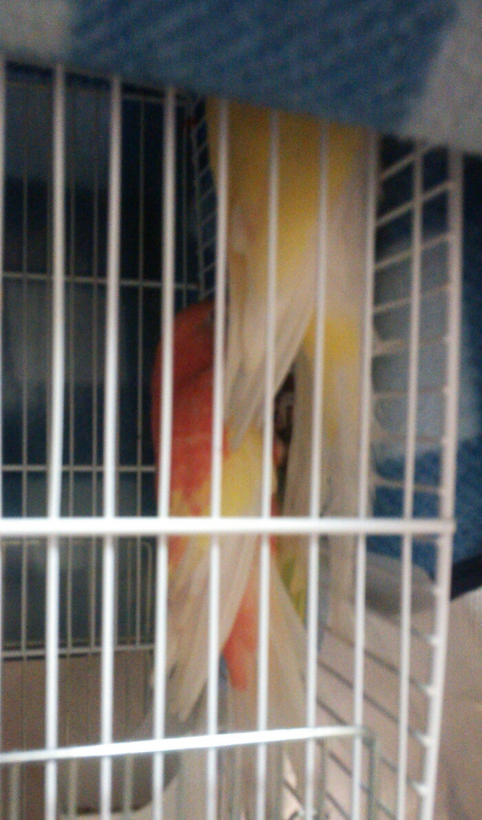 同居の練習として2つのカゴをドッキングして今2羽を一緒のスペースに入れていますが、家庭内別居のようで、1番上にももちゃん、1番下にたらこ、というおかしな景観が出来上がっています。