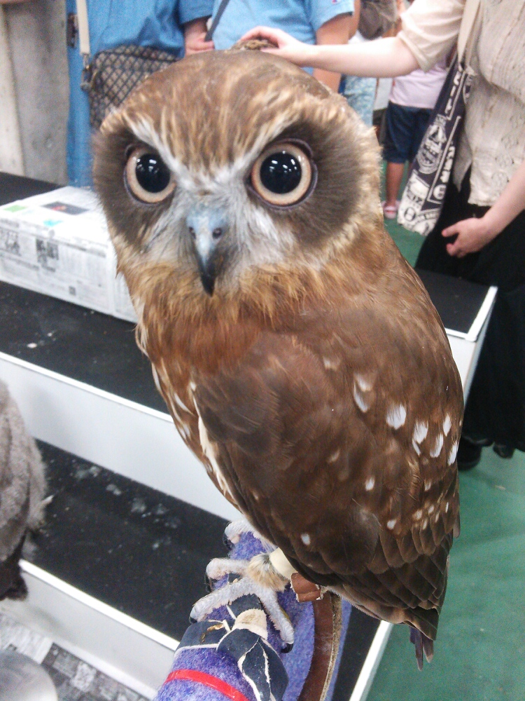 以前うちの近所にふくろうカフェができたので行ったのですが、そのカフェの鳥たちが来ていて、私が触れ合いさせてもらった(と思う)子がいました。覚えててくれたのかな?(ということにしたい!)ずーっとこちらを見つめてくれました。