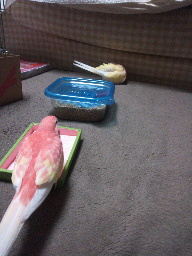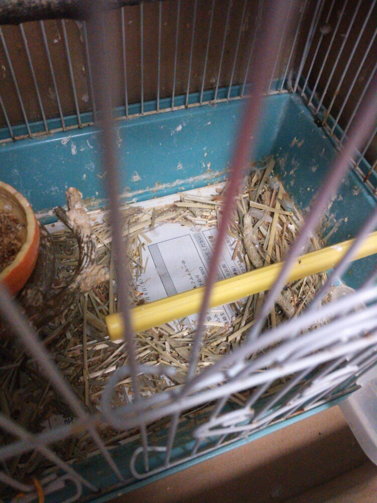 おそらく3歳か4歳になったのですが(ショップに長くいたようですので)少し前から止まり木にいなくて床にいる事が増えたことと網に足が引っかかってるわけでもないのにバタついて上に上がれない、ということが何度かあったのでフンキリをはずして、チモシーを敷いています。